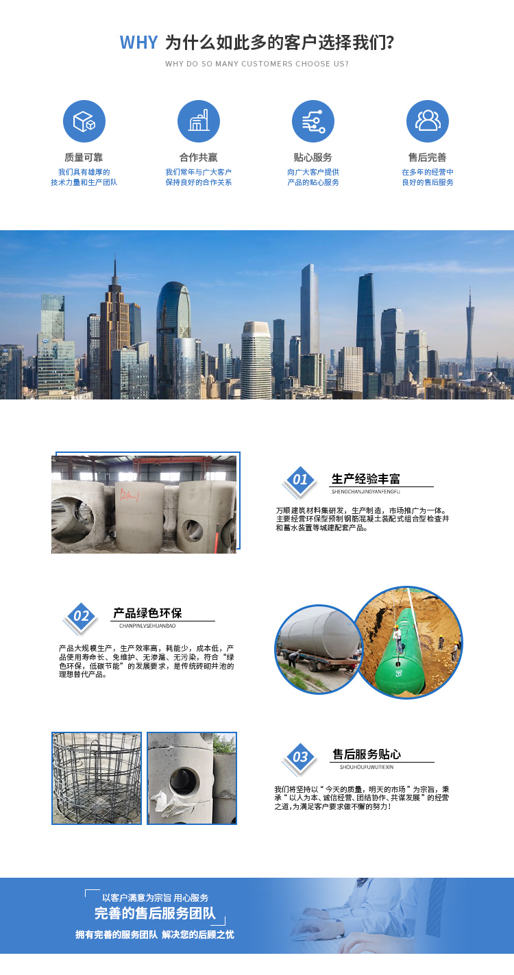 安徽萬渠建筑科技有限公司是集研發(fā),生產(chǎn)制造,市場推廣為一體的綜合性企業(yè)。公司主要經(jīng)營環(huán)保型預(yù)制鋼筋混凝土裝配式組合型檢查井和蓄水裝置等城建配套產(chǎn)品。產(chǎn)品生產(chǎn)過程采用獨特的生產(chǎn)工藝,機械化流水作業(yè)。產(chǎn)品大規(guī)模生產(chǎn),生產(chǎn)效率高,耗能少,成本低,產(chǎn)品使用壽命長、免維護、無滲漏、無污染,符合“綠色環(huán)保,低碳節(jié)能”的發(fā)展要求,是傳統(tǒng)磚砌井池的理想替代產(chǎn)品。